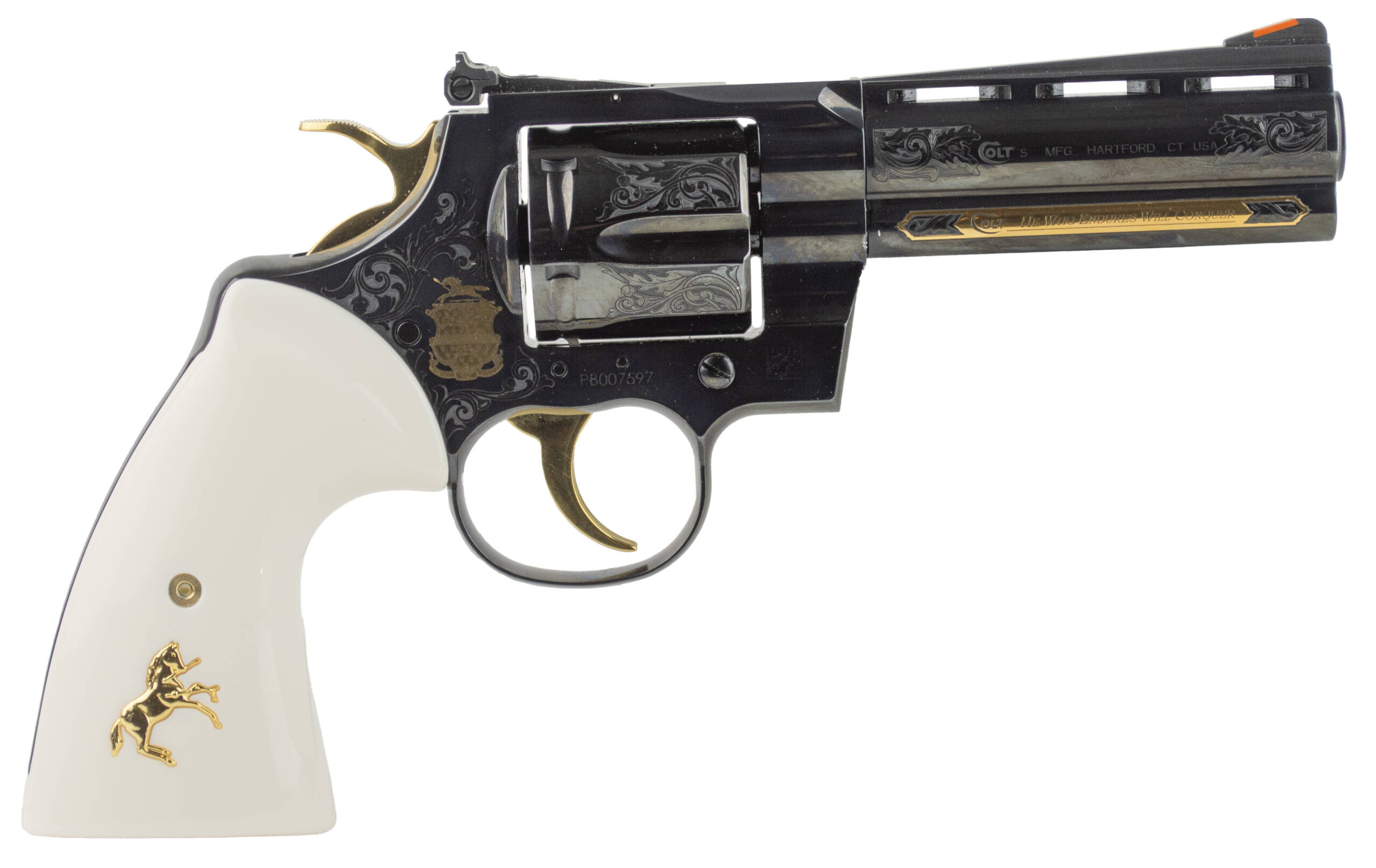 A tribute to heritage and craftsmanship the Colt Python Armsmear Edition honors the legacy of Samuel and Elizabeth Colt with the first revolver named after their historic Hartford estate. This exclusive edition blends Old World elegance with iconic American firearm engineering making it a centerpiece for collectors and Colt enthusiasts. – The richly blued 4.25 barrel frame and cylinder are intricately scroll-engraved with oak-leaf motifs while 24kt gold accents elevate key features including the trigger hammer and cylinder release. A 24kt gold-plated Armsmear badge on the frame bears the Latin inscription Vincit Qui Patitur He Who Endures Conquers also engraved in gold on the barrel lug. The revolver comes fitted with bright white simulated ivory grips featuring gold-plated Rampant Colt medallions with a second set of factory wood grips adorned with silver Colt emblems included for display or rotation. – Whether destined for display or kept as an heirloom the Armsmear Edition reflects Colt’s enduring prestige and a proud lineage rooted in American firearms history. – Specifications: – Caliber: .357 Magnum – Capacity: 6 rounds – Barrel Length: 4.25 inches – Finish: Deep blued with 24kt gold accents – Frame – Material: Carbon steel – Grips: Simulated ivory with gold Colt medallions (wood grips with silver medallions included) – Engravings: Oak scroll motif Armsmear badge Latin inscription (He Who Endures Conquers) – Action: Double/Single-action