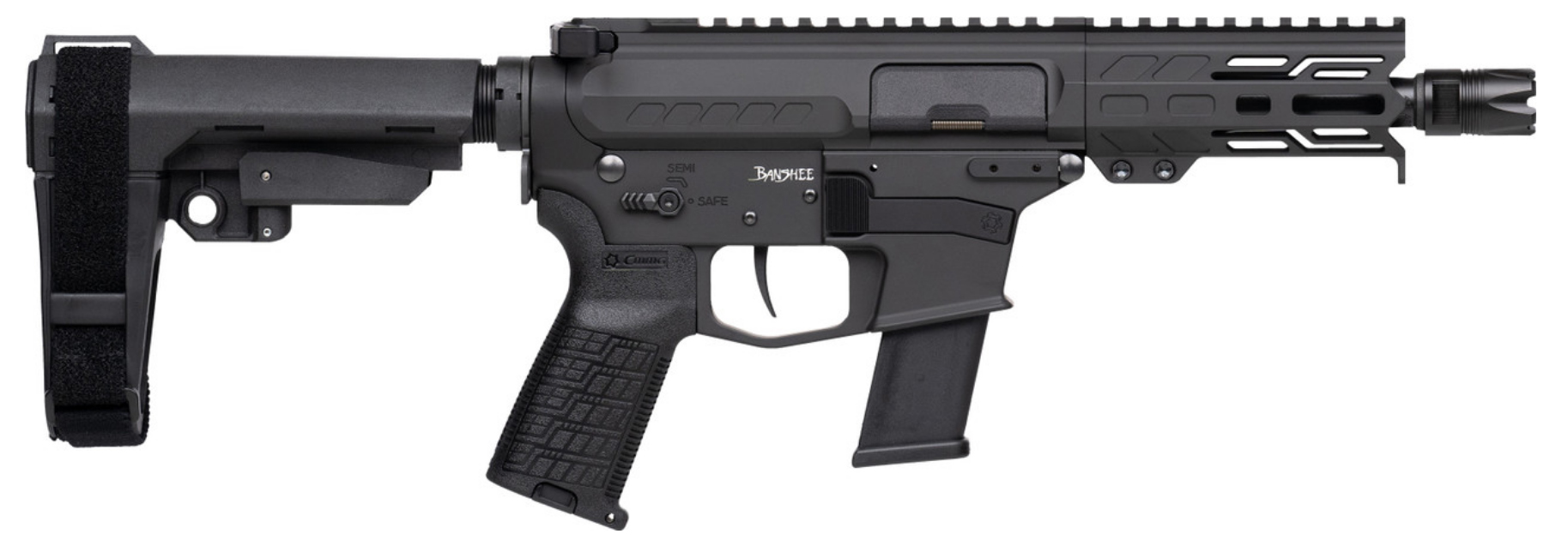 Chambered in the most American of pistol calibers this is the most compact .45 ACP BANSHEE available. Don’t be fooled though just because this BANSHEE is the right size to go with you anywhere doesn’t mean that you have to sacrifice ergonomics or shootability. – Platform MkG – Caliber .45 ACP – Operating System Fixed Ejector Radial Delayed Blowback – Barrel Length 5 – Barrel Twist 1:16 – Barrel Contour MT – Barrel Material 4140CM SBN – Barrel Twist 1:16 – Muzzle Device CMMG ZEROED Linear Compensator – Muzzle Thread 0.578 x 28 – Upper Receiver Billet 6061 T6 Aluminum – Lower Receiver MkG Forged 7075 T6 Aluminum – Hand Guard CMMG EML4 M-LOK – Finish Cerakote Standard – Charging Handle CMMG ZEROED Ambi – Pistol Grip CMMG ZEROED Pistol Grip – Buffer Type H AR15 – Receiver Extension CMMG 6 Position Fastback Extension – Stock / Brace CMMG RipBrace – Trigger Type ZEROED Drop-In Single Stage – Trigger Guard Integrated – Safety Selector CMMG ZEROED 60/90 Degree – Magazine Glock 13rd – Weight 4.4 lbs – Length 20.8