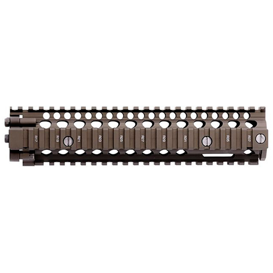 The Daniel Defense Rail Interface System (RIS II) was designed at the request of the United States Special Operations Command (SOCOM) for the SOPMOD II program. SOCOM had a specific requirement for a free float M203 solution and Daniel Defense responded designing a revolutionary product to meet the government’s need. The Daniel Defense RIS II allows the individual operator to free float the M203 grenade launcher without additional parts. As important special tools are not required to mount the M203 grenade launcher. This was accomplished by integrating all of the needed parts to free float the M203 into the rail itself. The Daniel Defense RIS II is to be used in conjunction with the MK12 Low Profile Gas Block. – KEY FEATURES – Aircraft Grade 6061-T6 Aluminum – Free-Floating Barrel Design For Increased Accuracy – Two-Piece Design for USSOCOM Allows For the Attachment of an M203 Grenade Launcher When Lower Rail Section is Removed. – Battle-Proven 6-Bolt Bolt-Up System Securely Attaches Handguard to the Upper Receiver – Grade 8 Military Specification Fasteners – Uninterrupted Upper Rail Platform & Mil-Spec 1913 Picatinny Rails – Mil-Spec Type III Hard Coat Anodized Finish (FDE) – Product Weight: 14.1 oz – Rail Length: 9.55 – Width: 2.23 – Height: 2.25 – Inside Diameter: 1.15 – Barrel Nut: Steel (For Patented Bolt-Up System) – Gas System: Carbine – Free Float: Yes – Continuous Upper Rail: Yes