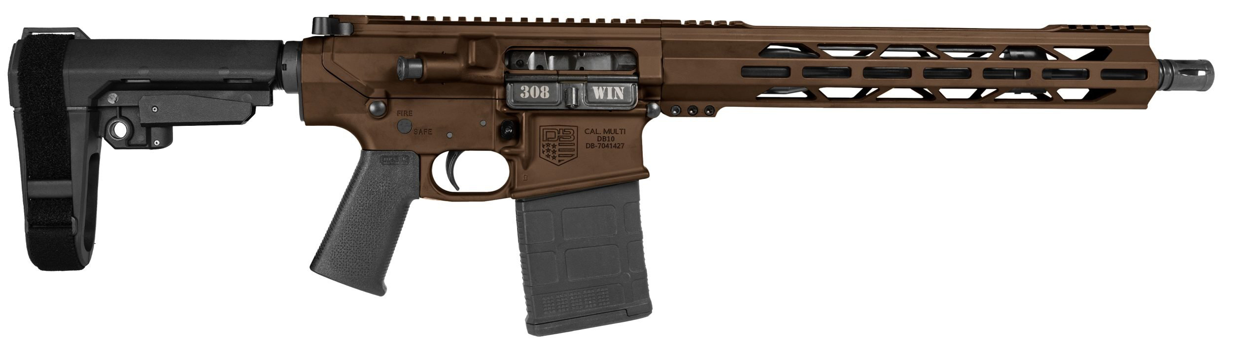 Finish: Midnight Bronze Cerakote – Caliber: .308 Winchester – Barrel: 13.5 in 1:10 RH Medium 4150 CrMov Black Nitride – Gas System: Mid-Length – BCG: Shot-Peened Magnetic Particle Inspected Mil Spec 8620 Carrier – Upper: A3 Flattop Forged 7075 T-6 Aluminum – Lower: Forged 7075 T-6 Aluminum (DB10 Black Gold Lower) w/ Enhanced Trigger Guard – Handguard: 13 in M-LOK (V-Rail) w/ Anti-Slip Texture Pads – Grip: Magpul MOE K Grip – Stock / Brace: SB Tactical SBA3 Brace – Magazine: Magpul Gen M3 PMAG 20 Round – Sights: None – Muzzle Device: A2 Flash Hider (5/8 x 24) – Trigger: Standard Mil-Spec – Weight: 5.1 lbs – Length (Collapsed / Extended): 31in