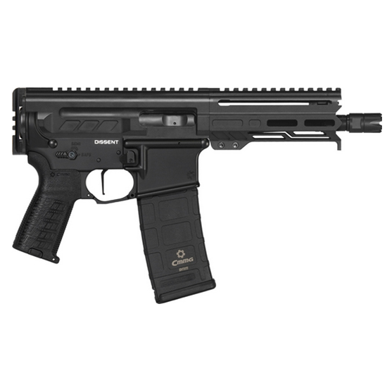 One thing that has always set the AR15 platform apart from many of its rivals has been modularity. With the 9mm DISSENT available in the Mk4 platform shooters have a 9mm pistol that can use the CMMG 9 AR Conversion magazines. These magazines feature the same profile as 5.56mm magazines for a familiar manual of arms and true double stack feeding from top to bottom for fast and easy loading. – Each DISSENT comes in a range of Cerakote finishes. The M-LOK handguard allows for sleek accessory mounting to complement your DISSENT while the 1913 picatinny rail end plate allows for the attachment of slings pistol braces or stocks*. Bolt operation is accomplished via the forward non-reciprocating side charger allowing for quick use while staying on target. – Platform: Mk4 – Caliber: 9mm – Operating System: Compact Action-Radial Delayed Blowback – Barrel Length: 6.5 – Barrel Twist: 1:10 – Barrel Contour: MT – Barrel Material: 4140CM SBN – Barrel Twist: 1:10 – Muzzle Device: CMMG ZEROED Linear Compensator – Muzzle Thread: 1/2 x 28 – Upper Receiver: DISSENT 9mm 7075 T6 Aluminum – Lower Receiver: Mk4 Forged 7075 T6 Aluminum – Hand Guard: CMMG 5.5 Proprietary – Finish: Cerakote – Charging Handle: DISSENT Side Charger -Left – Pistol Grip: CMMG ZEROED Pistol Grip – Receiver Extension: 1913 Picatinny Rail End Cap – Trigger Type: TriggerTech AR-D 2-Stage – Trigger Guard: CMMG ZEROED Trigger Guard – Safety Selector: CMMG ZEROED 60/90 Degree – Magazine: (2) CMMG 30rd – Weight: 4.6 lbs – Length: 14.7