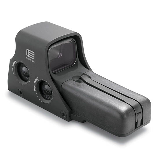 Probably the most popular HWS model out there the EOTech 512.A65 is one amazing piece of modern technology. With transmission holography optics parallax free this sight offers amazing visibility. The eye relief is unlimited and at 4 inch setting it offers a 30 yard field of view. The front window is made from thick glass to withstand any shock and damage while the rear window is made out of resistant laminate. – The design is very light weighing in only at 10.9 oz (309 grams) so as not to burden the user with useless weight like some other models do. The EOTech 512.A65 works optimally in temperatures between -40 and 150 F if AA lithium batteries are used. These temperatures rise to -20 to 140F if the operator chooses a different type of batteries. The sight is after all compatible with Alkaline and rechargeable batteries aside from the aforementioned AA lithium batteries. The sight works for 1000 continuous hours with the recommended lithium batteries. – The EOTech 512.A65 can be used at any daylight brightness both in twilight and broad sunshine. It has twenty different brightness settings to choose from which can be easily manually adjusted in a matter of seconds. All electronics of the EOTech 512.A65 are protected by a special casing making sure your sight will continue working even in very bad conditions. – This accessory’s popularity speaks for itself so you know that what you get is what most experiences weapon users want. Get your own EOTech 512.A65 from our site and you won’t regret it! – AA Battery model (supports Lithium and Alkaline) – 65 MOA circle with 1 MOA aiming dot reticle pattern – Includes rugged aluminum hood assembly and knobbed tool-less mounting bolt – Interfaces to standard 1 Weaver dovetail / Picatinny rail – Operation – Optics: Transmission holography – parallax free – Magnification: 1x – Eye Relief: Unlimited – Length/Width/Height: 5.4x2x2.25 (137×50.8×57 mm) – Weight: 10.9 oz (309 grams) – Temperature: -40 to 150 F (using AA lithiums); -20 to 140 F (all other battery choices) – Waterproof: Submersible to 10 ft depth – Sealing: Fogproof internal optics – Adjustment (per click): 0.5 MOA (1/2 at 100 yds) – Adjustment Range: +/- 40 MOA travel – Mount: 1 Picatinny (MIL-STD-1913) or Weaver rail – Return to Zero: Repeatable to 1 MOA after re-mounting – Heads-Up-Display Window – Optical Surfaces: Anti-glare coating – Window Dimensions: 1.20 x 0.85 (30 x 23mm) – Front Window Material: 1/8 solid glass – Rear Window Material: Shatter resistant laminate (3/16 thick) – Field of View (100 yds): 30 yds (28m) at a 4 eye relief – Electrical – Brightness Adjustment Range: 110000:1 brightest to lowest – No Night Vision Compatibility – Power Source: 2x 1.5V AA batteries (supports lithium alkaline or rechargeable) – Battery Life: 1000 continuous hours (lithium) at nominal setting 12; 600 continuous with AA alkaline – Brightness Settings: 20 settings with scrolling feature – Auto Battery Check Indicator: Flashing reticle upon start-up – Auto Shut-down: At 8 hrs- programmable to 4 hrs