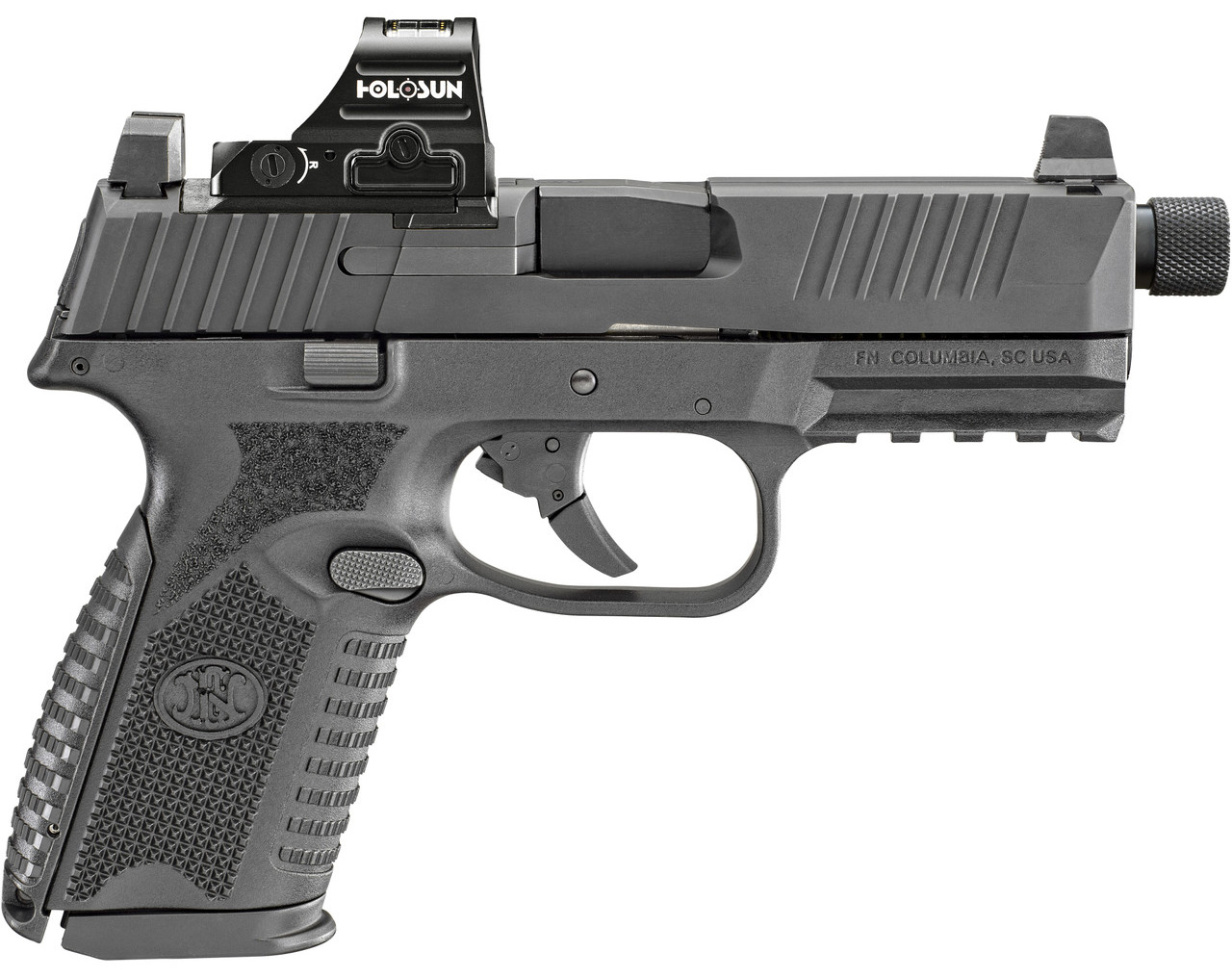 Semi-Automatic Pistol – Caliber: 9mm Luger – 4.5 Cold Hammer Forged Stainless Steel Barrel – Muzzle Threaded 1/2×28 TPI – 1:10 Right Hand Twist – (1) 15 Round Magazine (1) 24 Round Magazine – Suppressor Height 3-Dot Sights – FN Low Profile Optics Mounting System – External Extractor with Loaded Chamber Indicator – Front and Rear Cocking Serrations – Recessed Target Crown – Polished Chamber and Feed Ramp – Enhanced Grip Texturing – Interchangeable Backstraps – MIL-STD-1913 Picatinny Accessory Rail – Fully Ambidextrous Slide Stop Lever and Magazine Release – Trigger Pull: 4.5 – 6.7 lbs – Sight Radius: 5.8 – Height: 5.2 – Width: 1.35 – Overall Length: 7.9 – Weight: 27.9 oz – Steel Slide – Polymer Frame – Black Finish – Includes: – Holosun Red Dot Sight – Two Interchangeable Backstraps – One 15-round and One 24-round magazine