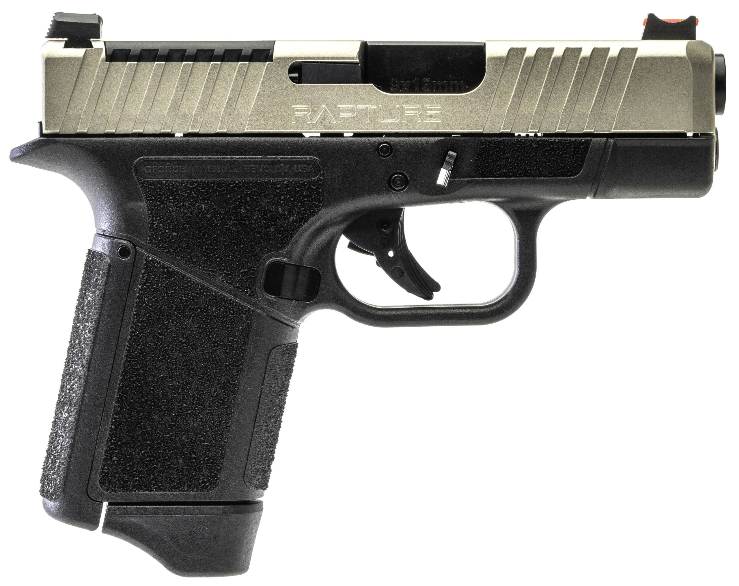 GForce Arms Inc. is proud to announce the GF9 Rapture sub-compact handgun made here in the U.S.A. – Rich in features the GF9 Rapture boasts front and rear slide serrations for fast weapon manipulation. Out of the box fiber optic sights are equipped and an optics ready slide able to mount any red dot using a RMR and RMSC (shield) footprint. A 3.25 9mm precision barrel to ensure you are putting accurate rounds on target. With aggressive stippling on the grip and Heavythumb rest the GF9 Rapture makes recoil management easy. A flat faced trigger aids in a smooth trigger pull. In addition four grip backstraps are included (0° 2° 4° and 6°) to create the perfect grip angle for the shooter. – The GF9 Rapture is a game changer for aftermarket part support. Fully customizable trigger slide barrel sights and optics. This allows the end user to truly make the GF9 Rapture their own; with the additions of different trigger weight slide ergonomics barrels and suppressors as well as red dots. – The GF9 is compatible with the Glock 26 all except the magazines. – FEATURES – STYLE 9MM Sub-Compact Handgun – MANUFACTURER GForce Arms USA – CHAMBER 9mm – BARREL LENGTH 3.25 – FRONT SIGHT Red Fiber Optic – REAR SIGHT Green Fiber-Optic – MATERIAL Glass-Filled Polymer and Steel – MAGAZINES Comes with two (2) 10 or 12 round magazines – OVERALL WEIGHT 1.4lbs (empty) – OVERALL LENGTH 6.6 – OVERALL HEIGHT 5.1 (with magazine) – OVERALL WIDTH 1.1 – SLIDE OPTICS FOOTPRINT COMPATIBILITY RMR and RMSC (shield)