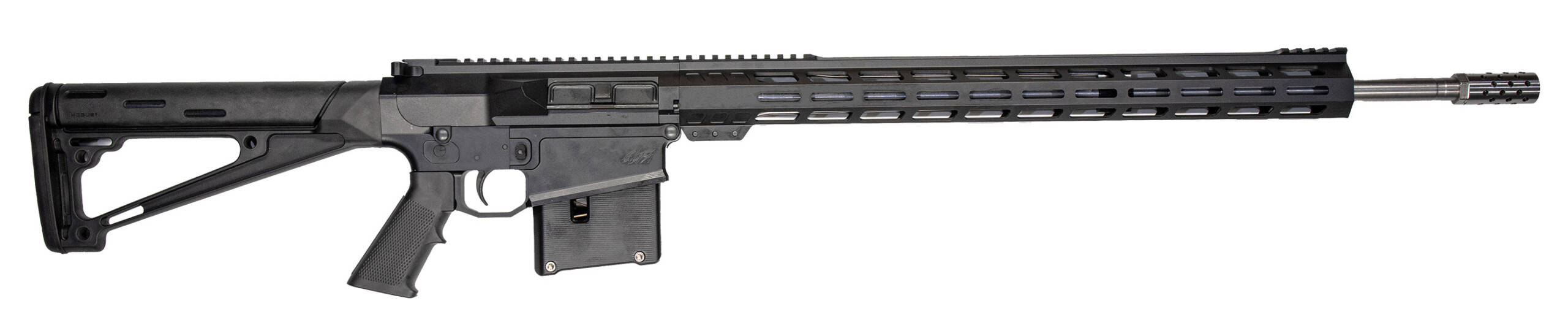 300 WIN MAG: – Barrel: 24 superior quality stainless steel (416R) with 5R rifling 1:10 twist = Overall length: 45.5 – Weight: 10.2 lbs – Muzzle Brake: 5/8 x 24 stainless steel (416R) – Lower: Aluminum billet (7075) – Upper: Aluminum billet – Handguard: 20 Aluminum M-Lok upper picatinny rail – Gas Block: .750 4150 Steel Black Oxide Coated – Gas System: Rifle – Stock: Hogue fixed rifle stock black – Magazine: GLFA custom aluminum 5 round black ( In the picture it’s still aluminum but it won’t be for production) – Grip: Standard – BCG: Custom design – Charging Handle: Custom design – AR-10 Compatible parts: Lower parts kits trigger safety