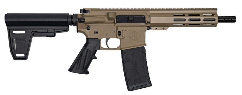 Type: AR15 Pistol – Finish: Cerakote – Caliber: .223 Wylde – Barrel: 7.5 – Barrel Options: 4150 CRMOV Nitride – Rifling: 1:8 Twist – Thread Pitch: 1/2×28 – Feed Ramp: M4 – Lower Receiver: Billet Aluminum 7075 – Upper Receiver: Forged Aluminum – Gas Block: . 750 – Handguard: 15.25 Aluminum 6061 M­LOK with Full Top Picatinny Rail – Trigger: Mil-Spec – Custom Muzzle Device – Pistol Brace: G-Force GFAB001 Ace of Brace Adjustable 5 Position Brace