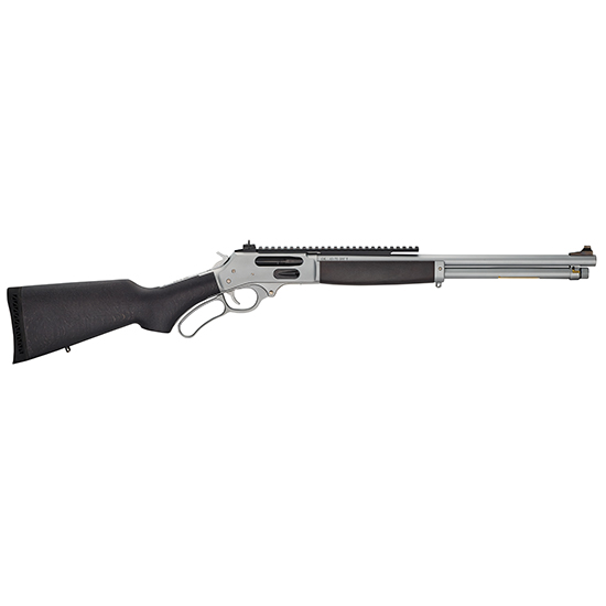 Caliber: .45-70 – Capacity: 4 Rounds – Barrel Length: 18.43 – Barrel Type: Round Hard Chrome Plated Steel – Rate of Twist: 1:20 – Overall Length: 37.5 – Weight: 7.10 lbs. – Receiver Finish: Industrial Hard Chrome Satin – Rear Sight: Full Length Picatinny Rail with Rear Peep Sight – Front Sight: Blade – Scopeability: Drilled and Tapped – Scope Mount Type: Weaver 63B – Stock Material: Stained Hardwood – Buttplate/Pad: Black Ventilated Rubber Recoil Pad – Length of Pull: 14 – Safety: Transfer Bar – Best Uses: Target/Hunting/Large Game/Collector/Deer Bear Hogs Moose Elk at 100 yards. – Embellishments/Extras: Extended Picatinny Scout Rail Swivel Studs Large Loop Lever