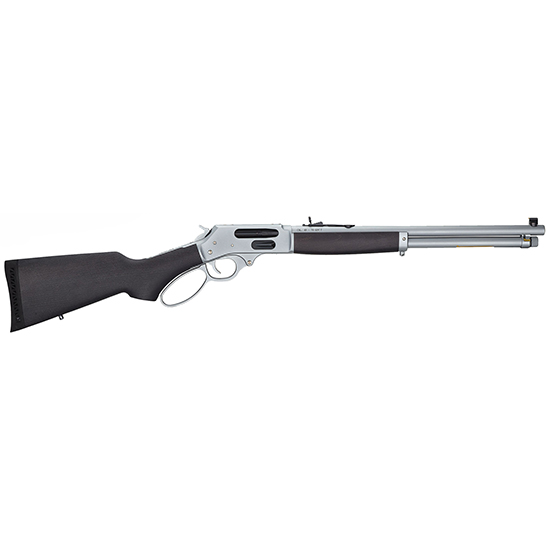 Action Type: Lever Action Large Loop – Caliber: .45-70 – Capacity: 4 Rounds – Barrel Length: 18.43 – Barrel Type: Round Hard Chrome Plated Steel – Rate of Twist: 1:20 – Overall Length: 37.5 – Weight: 7.08 lbs. – Receiver Finish: Industrial Hard Chrome Satin – Rear Sight: Fully Adj. Semi-Buckhorn w/ Diamond Insert – Front Sight: Brass Bead – Scopeability: Drilled and Tapped – Scope Mount Type: Weaver 63B – Stock Material: Stained Hardwood – Buttplate/Pad: Black Solid Rubber Recoil Pad – Length of Pull: 14 – Safety: Transfer Bar – Best Uses: Target/Hunting/Large Game Deer Elk best at up to 100 yards – Embellishments/Extras: Swivel Studs Side Gate
