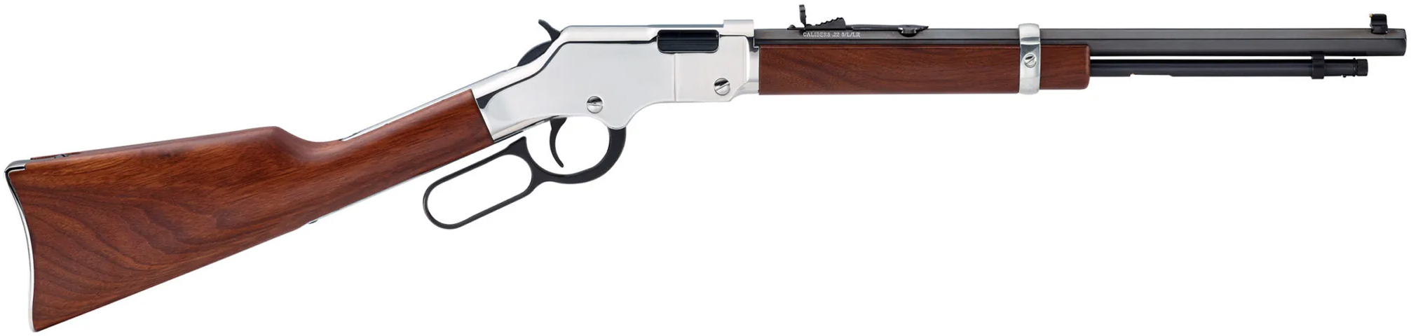 Item Description: Golden Boy Silver Youth .22 S/L/LR – Action Type: Lever Action – Caliber: .22 S/L/LR – Capacity: 12 LR/16 S – Barrel Length: 17 – Barrel Type: Octagon Blued Steel – Rate of Twist: 1:16 – Overall Length: 33.75 – Weight: 6.00 lbs. – Receiver Material: Alloy – Receiver Finish: Nickel Plated – Rear Sight: Fully Adj. Semi-Buckhorn w/ Diamond Insert – Front Sight: Brass Bead – Scopeability: Drilled and Tapped – Scope Mount Type: GB-CSM – Stock Material: American Walnut – Stock Style: Straight Grip – Buttplate/Pad: Nickel Plated – Length of Pull: 13 – Safety: ¼ Cock – Handing: L/R