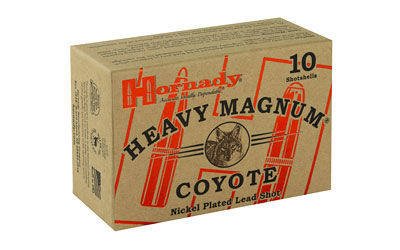 Hornady Heavy Magnum Coyote loads deliver lethal results and minimal pelt damage out to 50 yards. Loaded with 11/2 ounces of nickel plated lead shot in your choice of BB or 00 buckshot, these 3 inch 12 gauge shotshells are the perfect answer for close range predators.