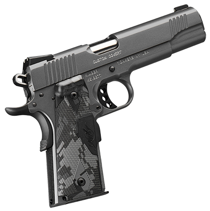 Covert pistols are the perfect combination of lightweight and meaningful features such as Crimson Trace Lasergrips 30 lines-per-inch front strap checkering a bumped and grooved beavertail grip safety and special Carry Melt treatment. – Specifications – Height (inches) 90° to barrel: 5.25 – Weight (ounces) with empty magazine: 31 – Length (inches): 8.7 – Magazine capacity: 7 – Carry Melt treatment – Recoil spring (pounds): 16.0 – Standard military length guide rod – Frame – Material: Aluminum – Finish: Charcoal gray KimPro II – Width (inches): 1.28 – 30 lines-per-inch front strap checkering with bordered base – Lanyard loop – Slide – Material: Stainless steel – Finish: Charcoal gray KimPro II – Front serrations – Barrel – Length (inches): 5 – Material: Stainless steel – Stainless steel match grade bushing – Twist rate (left hand): 16 – Sights – Tactical Wedge 3-dot tritium night sights – Radius (inches): 6.8 – Grips – Urban camouflage Crimson Trace Lasergrips – Trigger – Aluminum match grade – Factory setting (approximate pounds): 4.0 – 5.0