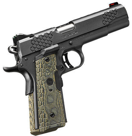 The KHX Custom is complete with laser-equipped Hogue Enhanced MagGrip G10 Grips and mainspring housing that form an external magwell and continuous wrap grip surface. There are green and red fiber optic sights for a bright clear sight picture. – Specifications – Height (inches) 90° to barrel: 5.25 – Weight (ounces) with empty magazine: 38 – Length (inches): 8.7 – Magazine capacity: 8 – Recoil spring (pounds): 16.0 – Full-length guide rod – Frame – Material: Stainless steel – Finish: Gray KimPro II – Width (inches): 1.28 – Slide – Material: Stainless steel – Finish: Gray KimPro II – Front serrations – Barrel – Length (inches): 5 – Material: Stainless steel match grade – Stainless steel match grade bushing – Twist rate (left hand): 16 – Sights – Fiber Optic – Radius (inches): 6.8 – Grips – Hogue Magrip G-10 Mag laser enhanced Grip – Trigger – Premium Aluminum – Factory setting (approximate pounds): 4.0-5.0