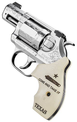 Limited edition model with western leaf and bonded ivory grips with the Battle of Gonzales motto Come and Take It on left panel and State of Texas with state flag insert on right panel. – Specifications – Height (inches): 4.46 – Weight (ounces): with empty cylinder: 23 – Width (inches): 1.39 – Length (inches): 6.62 – Cylinder capacity: 6 – Action: DA/SA – Frame – Material: Stainless Steel – Finish: Engraved over Brushed Stainless – Serrated backstrap – Barrel – Length (inches): 2 – Material: Stainless Steel – Finish: Engraved over Brushed Stainless – Sights – White 3-Dot – Radius (inches): 4.1 – Grips – Bonded Ivory – Bonded ivory grips with 1835 motto Come and Take It on left panel and State of Texas with state flag insert on right panel – Trigger – Non-Stacking – Double Action Factory setting (approx. pounds): 9.5-10.5 – Single Action Factory setting (approx. pounds): 3.00-3.50