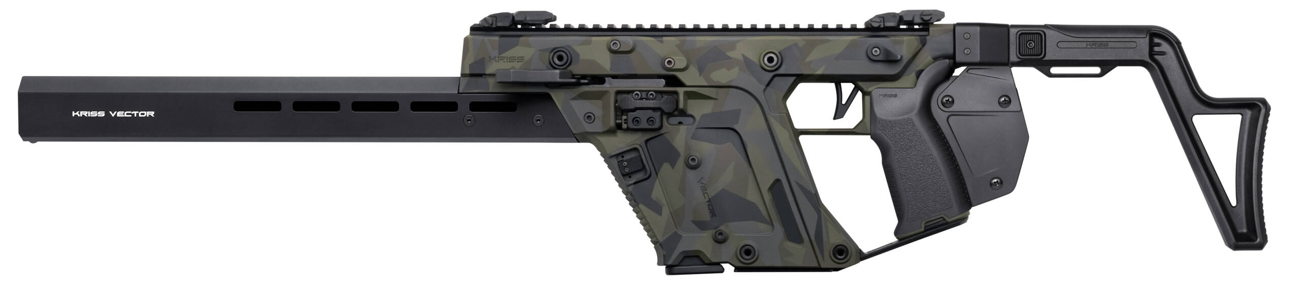 Tailored for recreational use and competition in pistol caliber carbine divisions the KRISS Vector Gen 3 CRB is the most accessible model with a 16 rifle length barrel and is compliant in most states. The upper and lower housings have been reimagined and enhanced for adaptability. The CRB comes equipped with a refreshed barrel shroud with M-LOK® mounting points. – The CRB is fed with full size Glock® magazines ensuring seamless interchangeability for users familiar with Glock-style mags. – REDESIGNED HOUSINGS – INTERCHANGEABLE PISTOL GRIP SYSTEM – AMBIDEXTROUS ADJUSTABLE FOLDING STOCK – M-LOK BARREL SHROUD – AMBI MAG RELEASE & REDESIGNED CONTROLS – Skeletonized Trigger with 0.7mm Pre-Travel – Ambidextrous Short Throw Safety Lever – Gen 3 Bolt Release and Mounting Block – Full Length MIL-STD 1913 Picatinny Top Rail – Short Charging Handle / Brass Check Function – 4-Pin Tool-Less Disassembly – Caliber 10mm – Model Vector CRB – Action Semi-Automatic – Operating System Closed Bolt Delayed Blowback – Barrel Length 16.0 in / 406.4 mm – Overall Length Collapsed 34.9 in / 887.5 mm – Overall Length Extended 36.9 in / 937.5 mm – Magazine(s) included (1) 10 Rounds – Color Woodland Delta CERAKOTE® Coating – Weight 7.7 lbs / 3.5 kg – Barrel Material 4140 Chrome Moly – Barrel Finish Black Nitride (QPQ) – Barrel Threading 9/16×24 RH – Trigger Type Pivoting Single Stage – Stock KRISS Ambidextrous Telescopic Folding Stock – What’s in the Box – (1) KRISS Vector Firearm – (1) Magazine – (1) Cleaning Kit – (1) Cable Lock – (1) User Manual – (1) Warranty Card