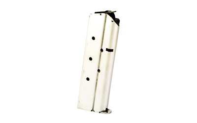 Stainless 8-round magazine for 1911 10MM pistols with full-length grip. Pre-drilled for base pad installation.