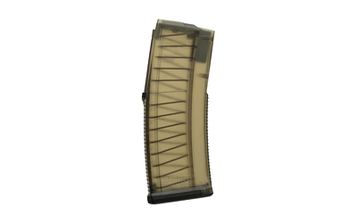 The TMAG 30 AR/M4 GEN M3 is a highly reliable, translucent, 30-round magazine for STANAG-compatible weapons chambered in 5.56×45 NATO/.223 Remington. Molded from a durable translucent material with an olive drab hue, it provides shooters the ability to visibly verify various ammunition types and the current round count. Featuring ribbed front and rear straps for improved purchase during magazine changes, the sides are left smooth to enhance visibility. Like the rest of the GEN M3 family of magazines, the TMAG incorporates similar internal geometry which translates into unmatched reliability when firing. The four-way, anti-tilt follower is paired with a durable USGI-spec, stainless-steel spring with a painted coil, which maintains the ,gas gauge, capability from the ,Window, magazine product line. The magazine body is clearly marked to show approximate round counts when inserted in a magazine well, and the paint-pen dot matrix allows for custom markings to be applied by the shooter. The TMAG’s low-profile floor plate also allows for compatibility with the full line of PMAG AR/M4 GEN M3 floor-plate accessories. The TMAG is optimized for Colt-spec AR15/M4 platforms, but modified internal and external geometry also permits operation with a range of other weapons such as the HK 416/MR556A1/M27 IAR, FN SCAR MK 16/16S, and others.