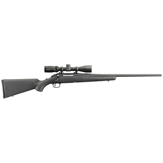 Action: Bolt – Caliber: 243 Win – Capacity: 4 – Finish: Matte Black – Stock: Synthetic – Scope: Vortex® Crossfire II® Riflescope – Twist: 1:9 RH – Barrel Length: 22 – Overall Length: 42 – Weight: 7.2 lb – Equipped with a factory-installed Vortex® Crossfire II® 3-9×40 riflescope with the Dead-Hold BDC reticle. – Ruger Marksman Adjustable Trigger offers a crisp release with a pull weight that is adjustable between 3 and 5 pounds allowing shooters to make that perfect shot. – Ergonomic lightweight stock (designed for quick easy handling) blends a classic look with modern forend contouring and grip serrations. – Soft rubber recoil pad is crafted for maximum recoil reduction. – Three-Lug 70 degree bolt provides ample scope clearance and utilizes a full diameter bolt body and dual cocking cams for smooth easy cycling from the shoulder. – Power Bedding® is an integral bedding block system that positively locates the receiver and free-floats the barrel for outstanding accuracy. – Hammer-Forged Barrel resulting in ultra-precise rifling that provides exceptional accuracy longevity and easy cleaning. – Features an easy-to-actuate tang safety that provides instant security visibility and accessibility. – Rotary magazine fits flush with the stock and offers the smooth feed that has become the hallmark of Ruger® rotary magazines. – Also features a drilled and tapped receiver for mounting the included scope bases sling swivel studs.