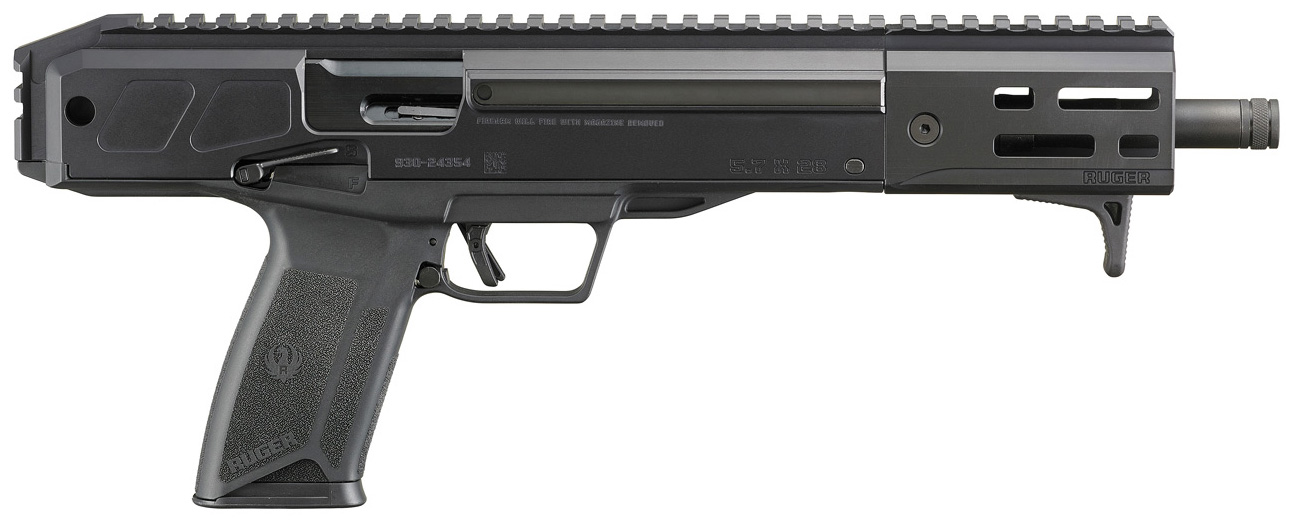 Caliber: 5.7x28mm – Capacity 10 – Handguard M-LOK® Attachment Slots – Sights None – Receiver Material Aluminum Alloy – Receiver Finish Type III Hard-Coat Anodized – Barrel Feature Threaded – Thread Pattern 1/2-28 – Barrel Length 10.30 – Overall Length 16 – Barrel Material Aluminum Alloy – Barrel Finish Nitride – Weight 66.5 oz. – Grooves 8 – Twist 1:9 RH – Model ships with a 10-round magazine for consumers in those states which limit magazine capacity. – Large format pistol utilizes the same steel magazines and familiar ergonomic controls as the Ruger-5.7 pistol. – Features a 10.3 nitride treated steel barrel for strength accuracy and longevity. – 1/2-28 TPI threaded barrel with thread protector allows for the attachment of popular muzzle accessories. – Impressive ergonomics with ambidextrous manual safety reversible charging handle ergonomic bolt release and extended magazine release latch. – Utilizes Ruger’s safe reliable and proven Secure Action fire-control system that combines a protected internal hammer with a bladed-safety trigger. The trigger has a short smooth pull clean break and positive reset. – CNC-milled handguard that is Type III hard-coat anodized aluminum for maximum durability with M-LOK® accessory attachment slots. Multiple QD sling sockets for maximum versatility. – Full-length Picatinny rail for optic mounting. – Safety features include: 1911-style ambidextrous manual safety; an integrated trigger safety; neutrally balanced sear with significant engagement and strong spring tension; and hammer catch to help prevent the hammer from contacting the firing pin unless the trigger is pulled. – Also includes: one Ruger-5.7 steel pistol magazine ambidextrous magazine button M-LOK QD sling socket hand stop and hex wrench for disassembly.
