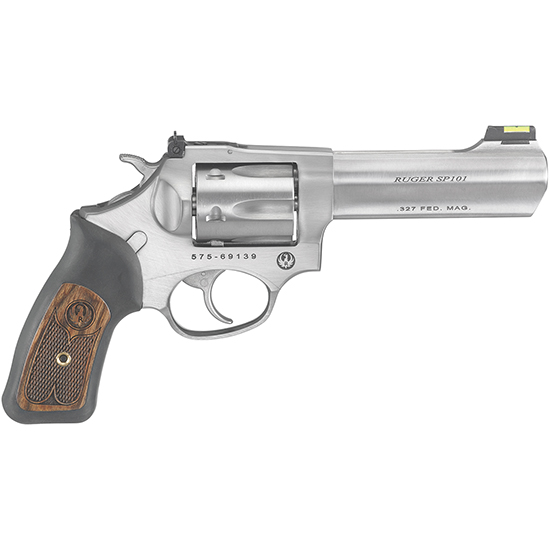 Action: DA/SA – Caliber: .327 Federal Mag – Capacity: 6rd – Barrel: 4.2 Stainless Steel Satin – Frame: Stainless Steel Satin – Cylinder: Stainless Steel Satin – Grip: Rubber with Wood Insert – Sights: Adjustable Rear Fiber Optic Front – Length: 9.12 – Weight: 29.5 oz. – CUSHIONED RUBBER GRIP with insert has no exposed metal in the backstrap making it extremely comfortable – PATENTED GRIP FRAME DESIGN that easily accommodates the use of a wide variety of custom grips – PATENTED RUGER TRANSFER BAR MECHANISM provides an unparalleled measure of security against accidental discharge – TRIPLE-LOCKING CYLINDER is locked into the frame at the front rear and bottom for more positive alignment and dependable operation shot after shot – EASY TAKEDOWN of integrated subassemblies requires no special tools and allows for no hassle maintenance and assembly – ALSO FEATURES: hard plastic case