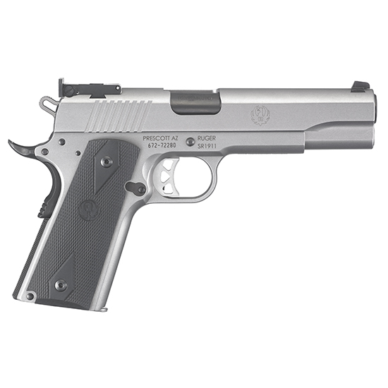 CALIBER: 10MM AUTO – Capacity: 8+1 – Slide Material: Stainless Steel – Barrel Length: 5 – Grip Frame: Low-Glare Stainless – Grip Panels: Black Rubberized – Model Type: Target – Slide Finish: Low-Glare Stainless – Width: 1.34 – Sights: Bomar-Style Adjustable – Weight: 40.4 oz. – Overall Length: 8.67 – Height: 5.45 – Grooves: 6 – Twist: 1:16 RH – Precision CNC-controlled machining process results in a superior slide-to-frame fit and smooth slide travel. – The bushingless stainless steel bull barrel provides additional weight at the muzzle for improved recoil control aided by a full length guide rod. – Ramped barrel is nitrided for maximum durability. – Positive barrel lock-up allows for superior accuracy out of the box. – Traditional design with replaceable grip panels and checkered backstrap. – Lightweight aluminum skeletonized trigger features an adjustable over-travel stop and provides a very crisp no creep light trigger pull with a quick positive reset. – Skeletonized hammer is lightweight and provides faster cycling. – Oversized beavertail grip safety provides positive function and reliability. – Extended thumb safety and slide stop lever for improved positive manipulation. – Integral plunger tube for slide stop and thumb safety is not staked and will never come loose. – Oversized ejection port and extended magazine release enhance competition performance. – Visual inspection port allows for visual confirmation of a loaded or empty chamber. – Features a flat mainspring housing and rear slide serrations for a positive grip. – Accepts standard aftermarket 1911 parts and accessories. – Classic original 1911 Series 70 design. – Also includes: swaged link pin; titanium firing pin; two stainless steel magazines.