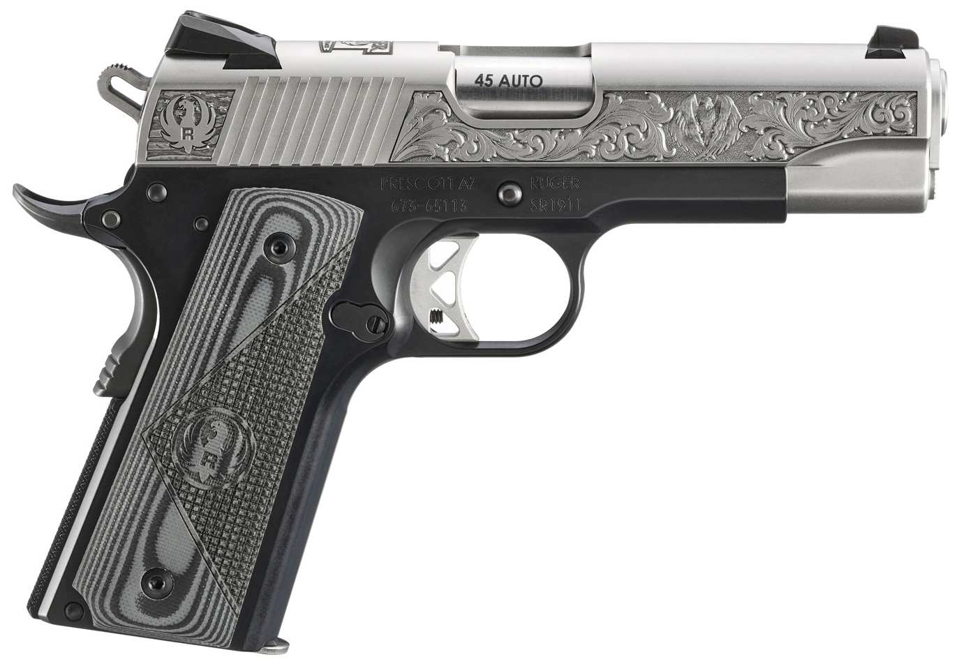 Caliber: 45 Auto – Capacity 7+1 – Slide Material Stainless Steel – Barrel Length 4.25 – Grip Frame Black Anodized – Grip Panels Black/Gray Deluxe Checkered G10 – Model Type Lightweight Commander-Style – Slide Finish Low-Glare Stainless – Width 1.34 – Sights Drift Adjustable Novak® 3-Dot – Weight 29.3 oz. – Overall Length 7.75 – Height 5.45 – Grooves 6 – Twist 1:16 RH – Southport CT Edition model features a finely engraved stainless steel slide including the Ruger logo and bald eagle on the sides with the Ruger logo and One Lacey Place adorned on the top of the slide. – Features a lightweight aluminum frame and polished titanium feed ramp. – Classic original 1911 fire control. – Precision CNC-controlled machining process results in a superior slide-to-frame fit and smooth slide travel. – Positive barrel lock-up allows for superior accuracy out of the box. – Traditional design with replaceable grip panels and checkered backstrap. – Lightweight aluminum skeletonized trigger provides a very crisp no creep light trigger pull with a quick positive reset. – Skeletonized hammer and titanium firing pin for faster lock time. – Oversized beavertail grip safety provides positive function and reliability. – Extended thumb safety and slide stop lever for improved positive manipulation. – Integral plunger tube for slide stop and thumb safety is not staked and will never come loose. – Oversized ejection port and extended magazine release enhance performance. – Inspection port allows for visual confirmation of a loaded or empty chamber. – Features a flat mainspring housing and rear slide serrations for a positive grip. – Accepts most standard aftermarket 1911 parts and accessories. – Also includes: Two 7-round stainless steel magazines; bushing wrench. – Production will be limited to 500 total units.