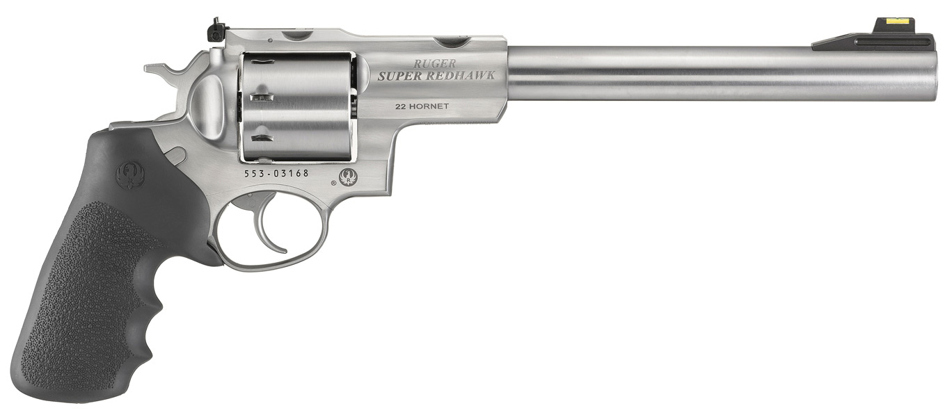 Caliber: 22 Hornet – Overall Length 15 – Barrel Length 9.50 – Capacity 8 – Grip Hogue Tamer Monogrip – Finish Satin Stainless – Front Sight HiViz Green – Rear Sight Adjustable – Weight 66 oz. – Twist 1:9 RH – Grooves 5 – Triple-locking cylinder is locked into the frame at the front rear and bottom for more positive alignment and dependable operation shot after shot. – Durable corrosion-resistant stainless steel construction. – Strong extended frame with extra metal in the top strap sidewalls and barrel mounting areas to handle powerful big game loads. – Hogue Tamer Monogrip with an internal recoil cushion positioned under the web of the hand helps reduce the impact of powerful loads while the peg-style grip frame easily accommodates custom grips. – Transfer bar mechanism provides an unparalleled measure of security against accidental discharge. – Replaceable HiViz front sight and adjustable rear sight. – Cold hammer-forged barrel results in ultra-precise rifling that provides exceptional accuracy longevity and easy cleaning. – Patented integral mounts are machined directly on the solid-steel barrel rib to provide a stable mounting surface for the included scope rings eliminating a potential source of looseness and inaccuracy in the field.