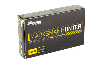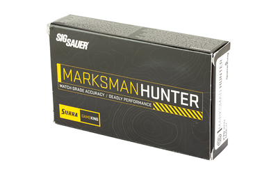 The Sig Sauer Marksman Hunter line of ammunition was designed with the practical hunter in mind. Precision-loaded for competition-level accuracy at long range, these rounds will be your reliable companion in the field. The boat tail design reduces drag, ensuring a flatter trajectory and less wind drift – for those moments when precision really counts. Each bullet features a thick jacket for consistent performance on medium game, with a skived bullet nose to ensure consistent expansion, delivering the power you need.