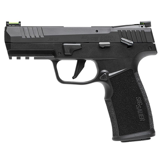 The new P322 was completely designed and built by SIG SAUER in New Hampshire and is loaded with premium features including an optic-ready removable rear sight plate so you can easily add a ROMEOZero red dot optic without the use of adapter plates. The P322 also comes with a threaded barrel adapter making it suppressor ready right out of the box and with its ambidextrous controls interchangeable flat and curved triggers and fiber optic front and rear sights the new P322 is the highest capacity most advanced 22 pistol in its class. – 10 Round Magazine Capacity – Optic Ready Removable Rear Sight Plate – Suppressor-Ready With Included Threaded Barrel Adapter – Interchangeable Trigger Shoes (flat and curved included) – Fiber Optic Front and Rear Sights – Ambi Controls With Reversible Magazine Catch – Magazine Loader Included – Includes (2) 10rd magazines – CALIBER: 22LR – MAGS INCLUDED: (2) 10rd Polymer Mag – SIGHTS: Fiber Optic Front / Adjustable Rear – THREADED BARREL: Yes – PISTOL SIZE: Compact – OVERALL LENGTH: 7 in [178mm] – OVERALL WIDTH: 1.4 in [36mm] – HEIGHT: 5.5 in [140 mm] – BARREL LENGTH: 4 in [102mm] – WEIGHT: 17.1 oz [484g] – SIGHT RADIUS: 6 in [152mm] – ACCESSORY RAIL: M1913 – TRIGGER ACTION: SAO – TRIGGER TYPE: Flat / Curved (both included) – GRIP MODULE: Compact Polymer – GRIP COLOR: Black – BARREL MATERIAL: Carbon Steel – FRAME MATERIAL: Stainless Steel / Polymer – SLIDE FINISH: Hard Coat Anodized – SLIDE MATERIAL: Alloy – MANUAL SAFETY: Yes – OPTIC READY: Yes
