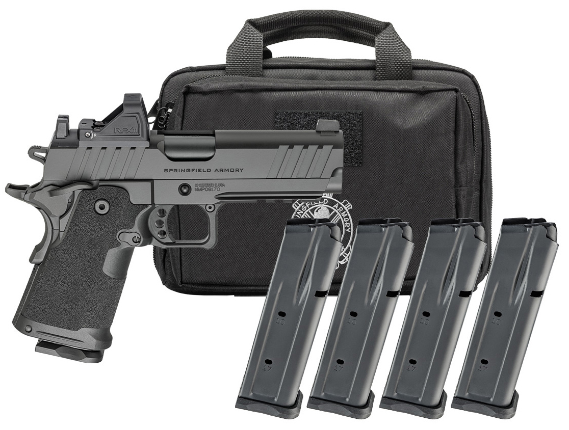 The Prodigy Compact from Springfield Armory® takes the proven 1911 platform and enhances it with double-stack capacity and a carry-focused feature set. Reconfigured around a 15-round double-stack magazine the Prodigy’s compact polymer grip module mounts to its lightweight aluminum frame to reduce weight while a shortened beavertail and recontoured hammer further downsize the overall footprint. Optics ready with a tritium front sight and and Picatinny rail the Prodigy Compact combines the most beloved characteristics of the 1911 with modern capacity for EDC. – Caliber 9mm – Color Black – Barrel 4.25 Forged Stainless Steel Black DLC Match Grade Bull 1:16 – Slide Forged Carbon Steel Black Cerakote® Optics-Ready – Frame Billet 7075-T6 Hardcoat Anodized Aluminum Black Cerakote® – Sights White-Dot Front Black Serrated Rear Viridian®RFX11 Green Dot – Recoil System 2 Piece Full Length Guide Rod – Grips Polymer – Magazines (4) 15-Round – Weight 29 oz – Length 7.8 – Height 5.1