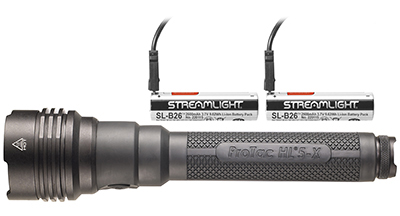 The super bright 3500-lumen ProTac HL® 5-X flashlight is available in two configurations: rechargeable with two of our Streamlight SL-B26® protected Li-Ion USB rechargeable battery packs or non-rechargeable with four CR123A lithium batteries. – Multi-fuel: Uses (2) Streamlight SL-B26® protected Li-Ion USB rechargeable battery packs; also accepts (4) CR123A lithium batteries – Features TEN-TAP® programming – Choice of three user-selectable programs: – 1) high/strobe/low 2) high only 3) low/medium/high – High (SL-B26): 3500 lumens; 452m beam; runs 1.25 hours – High (CR123A): 2500 lumens; 385m beam; runs 1.5 hours – Medium: 1000 lumens; 237m beam; runs 2.5 hours (CR123A); runs 3 hours (SL-B26) – Low: 250 lumens; 120m beam; runs 10.5 hours (CR123A); runs 11.5 hours (SL-B26) – Strobe for signaling or disorienting: runs 1.5 hours (CR123A); runs 1.25 hours (SL-B26) – IPX7 waterproof to 1 meter for 30 minutes; 1 meter impact resistance tested – Durable anodized aluminum construction – Anti-roll head prevents the light from rolling away when placed on a flat surface – Rubber sleeve provides thermal insulation and a sure grip – Length: 9.53 in (23.65 cm) – 1 lb 3.4 oz (550g) with (2) SL-B26 battery packs; 1lb 2.4 oz (522g) with (4) CR123A batteries – Limited lifetime warranty – High Lumens 3500 – Run Time on High 1.25 hours – Run Time on Low 11.50 hours – Beam Distance 452 meters – Max Candela 51000 – Battery Type SL-B26 Rechargeable Battery Pack CR123A Lithium – Battery Quantity 2-4 – Length 9.53 inches (24.21 centimeters) – Weight 1 pounds 2.40 ounces (521.63 grams) 1 pounds 3.40 ounces (549.98 grams) – Colors Black