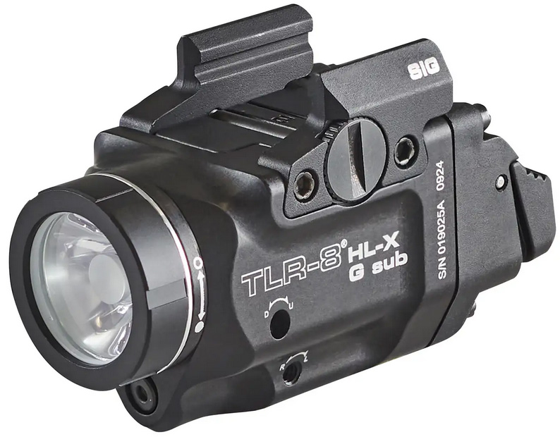 The TLR-8® HL-X G sub high-lumen rail-mounted light is engineered to produce a longer reaching beam. It accepts either Streamlight’s SL-B9® USB-C rechargeable protected lithium-ion battery pack or a single CR123A lithium battery. Interchangeable rear paddle switches accommodate your shooting style. – Multi-fuel: Uses (1) Streamlight SL-B9® protected Li-Ion USB-C rechargeable battery pack (included) or (1) CR123A lithium battery – Engineered to produce a longer reaching beam – SL-B9: 1000 lumens; 10000 candela; 200m beam; runs 30 minutes (default) or programmable to 500 lumens; 5000 candela; 141m beam; runs 1 hour – CR123A: 500 lumens; 5000 candela; 141m beam; runs 1.5 hours – Laser mode runs 10 hours – Ambidextrous rear paddle switches with HIGH and LOW options – Safe-off feature prevents accidental activation; saves batteries – Rail grip clamp securely attaches/detaches without putting your hands in front of the muzzle – Durable anodized machined aluminum construction – User-enabled strobe function – Securely attaches to select subcompact handguns: GLOCK® 43X MOS/48 MOS and GLOCK® 43X RAIL/48 RAIL SIG SAUER® P365® and P365® XL (closed rail systems)* and the Springfield Armory® Hellcat® as well as select 1913 short railed subcompact handguns including the Smith & Wesson® M&P® M2.0® subcompact Beretta® Px4 Storm subcompact Springfield Armory® XD-E XD-S® and Hellcat® Pro Heckler & Koch® HK45 compact and SIG SAUER® P365® XMACRO – Length: 2.51 in (6.38 cm) – Weight w/ SL-B9: 2.87 oz (81.4g); Weight w/ CR123A: 2.77 oz (78.5g) – IPX4 water-resistant – Limited lifetime warranty – Assembled in the USA – Product Specifications – High Lumens 1000 – Beam Distance 200 meters – Max Candela 10000 – Battery Type SL-B9 Rechargeable Battery Pack CR123A Lithium – Battery Quantity 1 – Length 2.51 inches (6.38 centimeters) – Weight 2.77 ounces (78.53 grams)-2.87 ounces (81.36 grams) – Colors Black