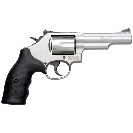 Action: SA/DA – Caliber: .357 Magnum / .38 S&W Special +P – Capacity: 6 – Finish: Stainless – Material: Steel – Grips: Black Synthetic – Sights: Red Ramp / White Outline Adjustable – Barrel Length: 4.25 – Overall Length: 9.6875 – Weight: 36.6 oz – Return of the K-Frame .357 Magnum – Full Top Strap and Barrel Serration – Ball-Detent Lock-Up – 2-Piece Barrel – The K-Frame revolver is one of the most important innovations in Smith & Wesson history and was built specifically to handle the .38 S&W Special cartridge. Since its introduction in 1899 the K-Frame has been a favorite for military and police professionals as well as target shooters and enthusiasts. Today’s K-Frame is available in .22 LR and .38 S&W Special.