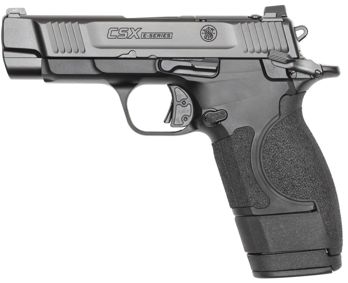 Introducing the new Smith & Wesson CSX E-series the next evolution in the CSX line. It boasts an enhanced E-Series trigger with a clean break and reset extensive grip texture coverage and a modular grip adapter that converts from micro-compact to compact frame size. This optic-ready pistol is chambered in 9MM with 12 15 or 17-round capacity options (magazines and adapters included) making it the advanced evolution of a classic platform perfect for those who demand more from their concealed carry. – MODULAR GRIP ADAPTER- The modular grip adapter lets you take your CSX and size to meet your needs. Size down for ultimate concealment or size up for better handling when shooting. – E-SERIES® TRIGGER- Newly enhanced E-series trigger that has a light clean break and an improved reset. The straighter pull to the rear aids in accuracy when firing. – OPTICS-READY- Modified RMS-C/507K optic footprint that features our ClearSight cut designed to strategically divert gasses away from your optic lens when firing. – 3.6 1:10 twist stainless steel barrel w/Armornite® finish. – Optic ready modified RMS-C/507K footprint. – White dot sights. – Aluminum alloy frame w/flat black finish. – Stainless steel slide w/Armornite® finish. – Interchangeable backstraps. – Ships with (one) 12-round (one) 15-round (one) 17-round magazines. – width 1.12 in – length 6.1 in – height 4.6 in – weight 23.5 oz – CALIBER 9MM – SIZE MICRO-COMPACT – CAPACITY 121517 – ACTION SINGLE ACTION – BARREL LENGTH 3.6 – GRIP POLYMER – SIGHTS WHITE DOT – OPTIC READY YES – SAFETY THUMB SAFETY – COLOR/FINISH BLACK – STATE COMPLIANCE DE – BARREL MATERIAL STAINLESS STEEL – FRAME ALUMINUM – NUMBER OF MAGAZINES 3