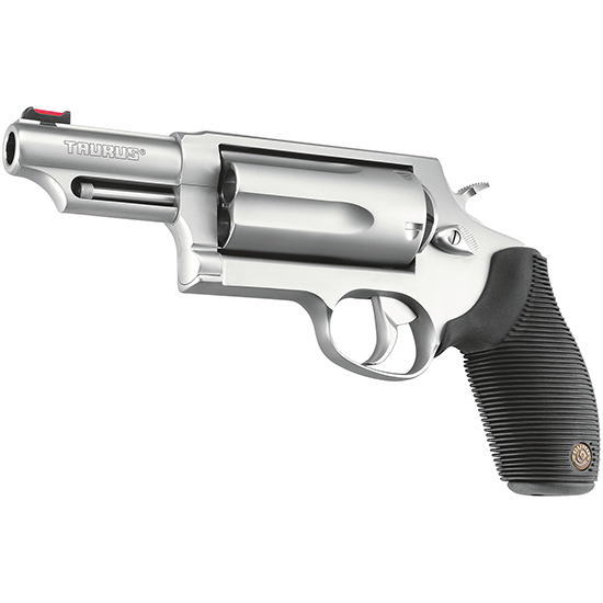 Action: DA/SA – Caliber: .45 Colt/.410ga (3) – Capacity: 5rd – Barrel: 3 Stainless Steel Matte – Frame: Stainless Steel Matte – Cylinder: Stainless Steel Matte – Grip: Ribber Black – Sights: Fixed Red Fiber Optic Front – Safety: Taurus Security System Transfer Bar – Weight: 36.8 oz – The Taurus Judge® is so named because of the number of judges who carry it into the courtroom for their protection. Capable of chambering both .410 3 shotshell and .45 Colt Ammunition this amazing combo gun is ideal for short distances – where most altercations occur or longer distances with the .45 Colt ammo. We have finely tuned the rifling to spread the shot pattern at close quarters or to guide the .45 cal. bullet to the target. Fully customized with fixed rear sights fiber optic front sights and Taurus Ribber Grips® the Taurus Judge is one decision-maker that lays down the law.