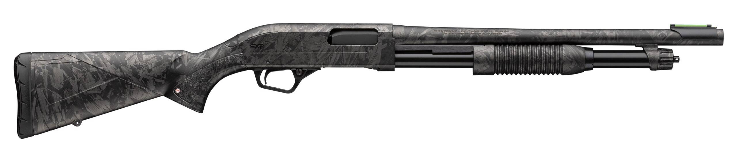2024 SHOT Show Special- Defender pump shotgun with full coverage Forged Carbon finish. Uses interchangeable Invector-Plus chokes. Chrome-plated bore and chamber. Available in 12 or 20 gauge. – SXP Forged Carbon Defender Features – Forged Carbon hydrodip finish – Composite stock and cylinder forearm – Aluminum alloy receiver – 18 barrel – 12 gauge 3 chamber – 20 gauge 3 chamber – Removeable fiber-optic sight and brass bead – One Invector-Plus choke tube included (CYL) – Sling swivel studs – Super X Pump Features – Hard Chrome-Plated Chamber and Bore – Speed-Plug System – Reversible Crossbolt Safety – Back-Bored Technology – Drop-Out Trigger Group – Black Chrome Finish on the bolt barrel slide and action bars – Durable E-Coating on the Magazine Tube – Inflex Technology Recoil Pad